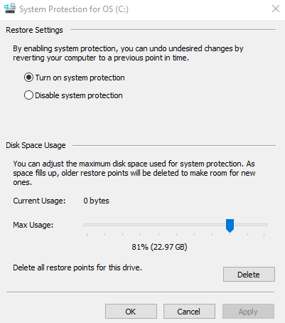 Click on System Restore. If System Restore is grayed out, this means you do not have restore points currently set up. You will not have any to revert to. However, you may desire to create some now, or later if you suspect you have a virus on your system. You can do this by clicking on “Configure”, and then clicking on “Turn on system protection”. You will also need to adjust the slide bar so that your computer can devote some disk space to creating a restore point.