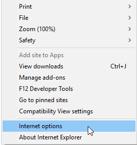 Click on the cog wheel on the top right corner (Tools), then select Internet options.