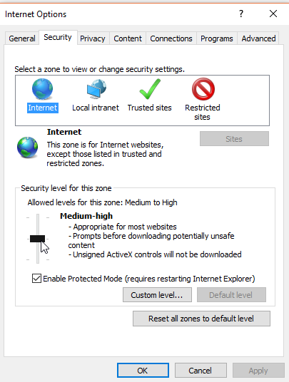 Click on the Security tab at the top and then adjust the bar under Security level for this zone to determine how secure you want your browsing to be. You may also want to click Enable Protected Mode, which adds an extra layer of security from malicious websites.