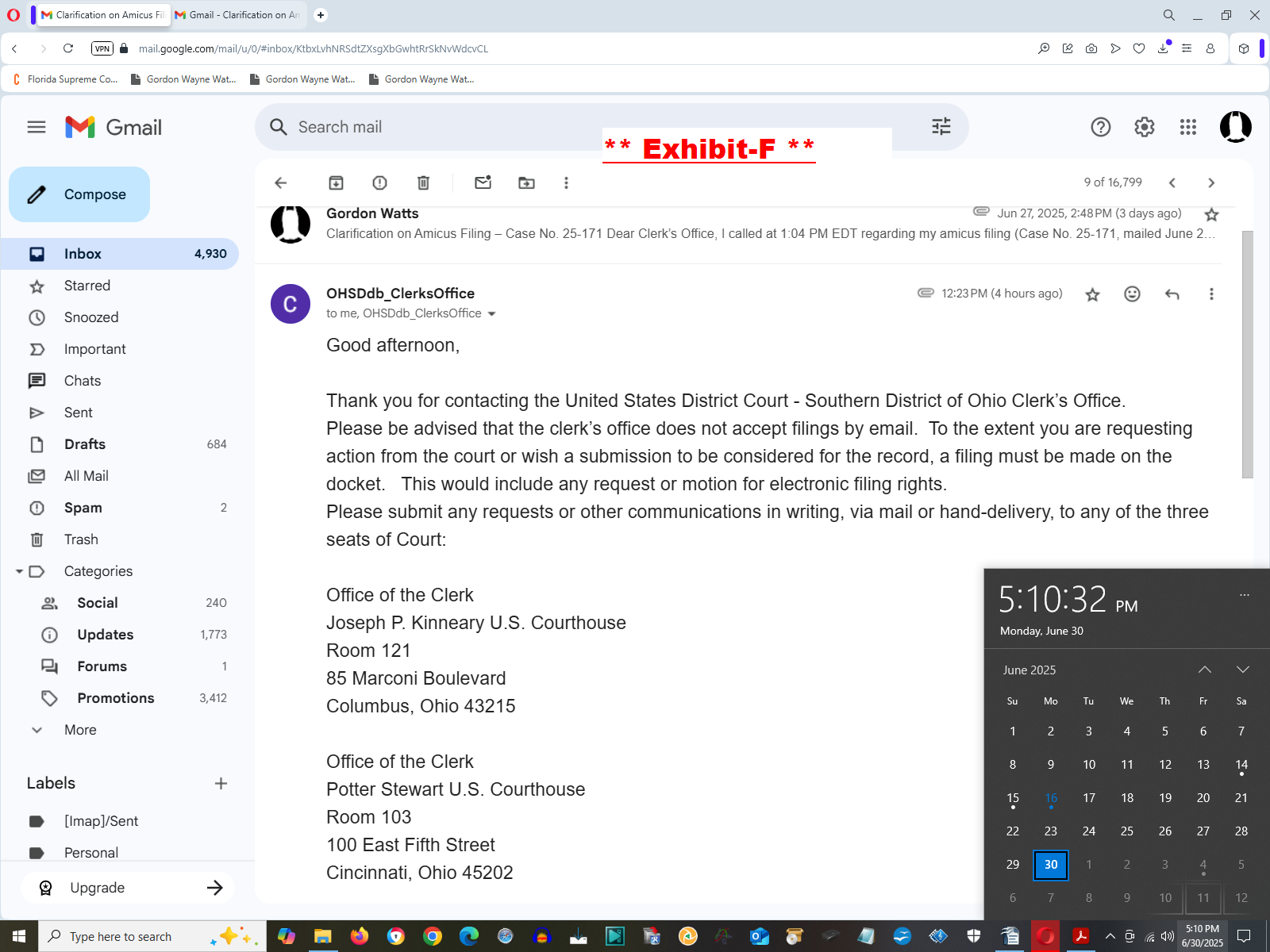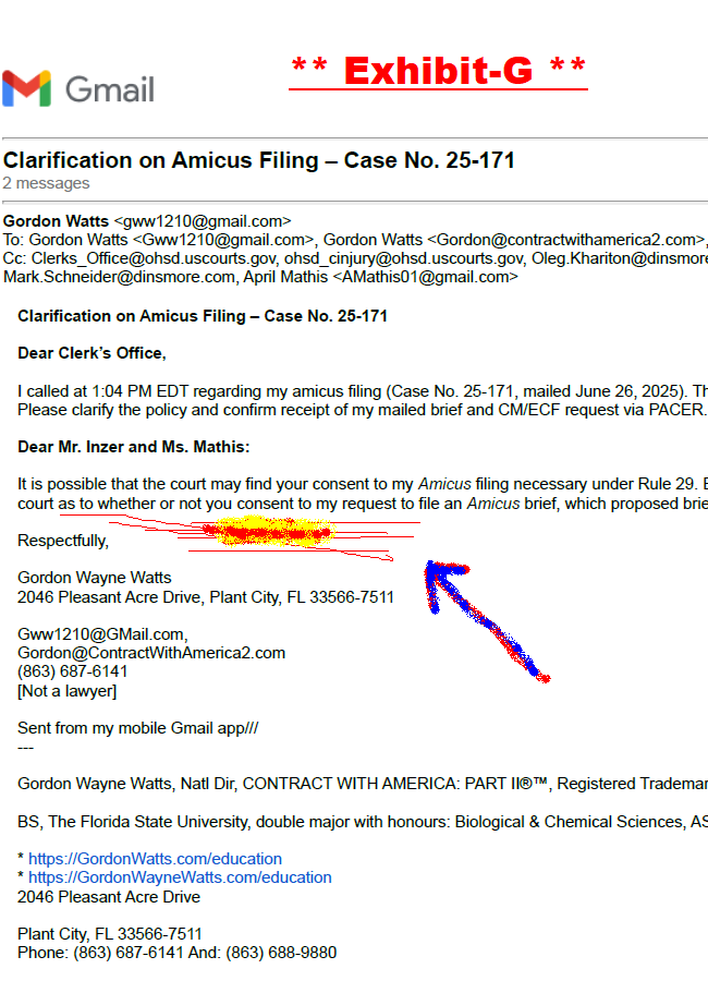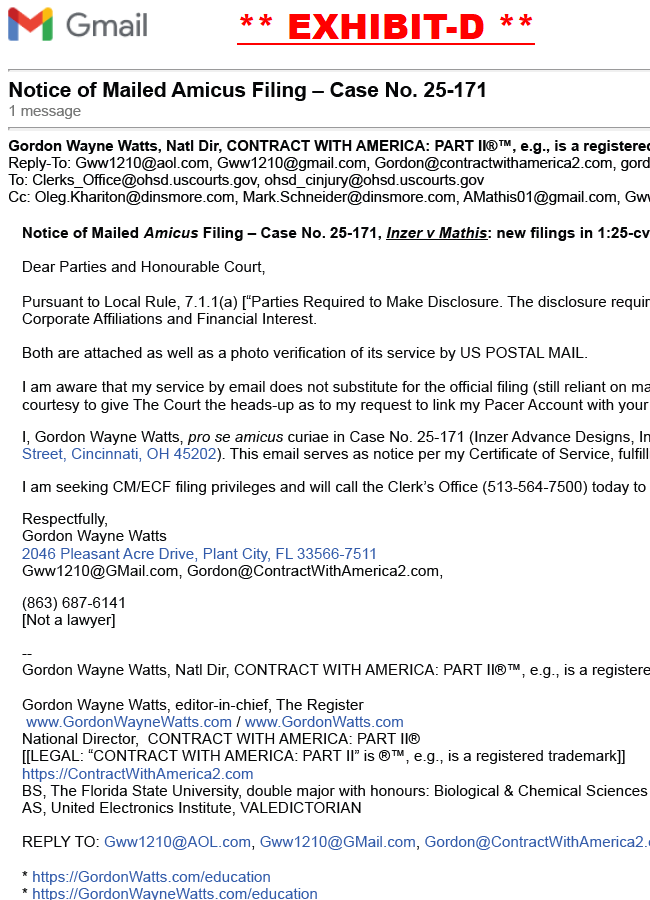 2. Service of Filings: The undersigned gives judicial notice that all parties and the Court were served by (a) postal mail (Exhibit-B) on June 26, 2025, to 100 East Fifth Street, Cincinnati, OH 45202 , and Judge Chambers (Exhibit-C), (b) email on June 27, 2025, at 12:25 PM and 2:48 PM EDT to addresses including Clerks_Office@ohsd.uscourts.gov and AMathis01@gmail.com (Exhibit-D), and (c) public posting on the undersigned’s web-ring GordonWatts.com, GordonWayneWatts.com, and powerlifting communities, as detailed in the Certificate of Service (Exhibit-E). On Monday, June 30, 2025 at 12:23 PM EDT, the clerk's office acknowledged Watts' filing by email, and replied that “Please be advised that