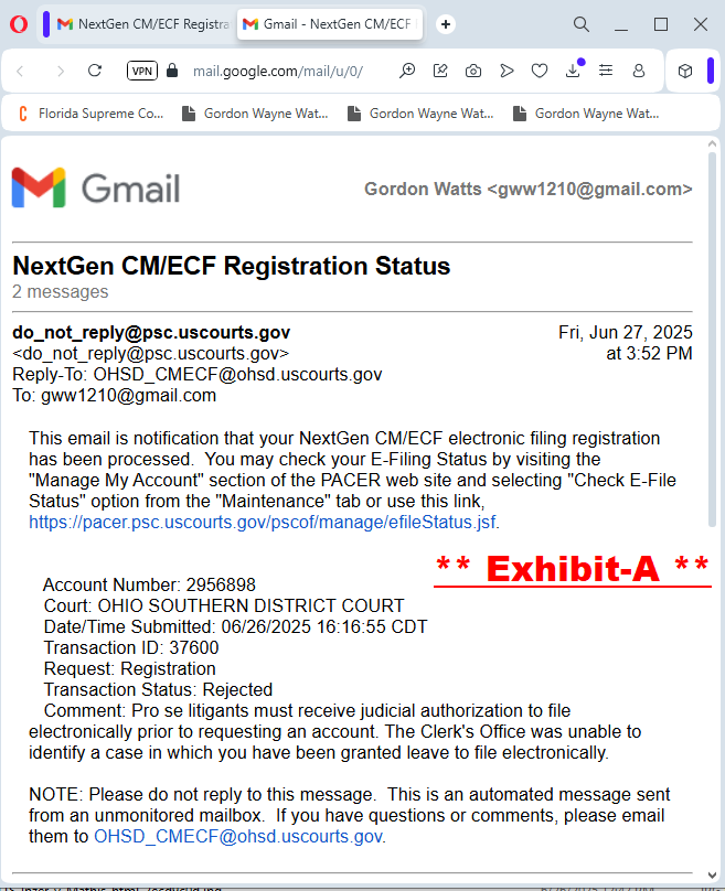 1. CM/ECF Rejection: The undersigned gives judicial notice that his request for NextGen CM/ECF electronic filing registration (Account No. 2956898, Transaction ID 37600, submitted 06/26/2025 16:16:55 CDT) was rejected, as notified via email on 06/27/2025 (Exhibit-A), due to the requirement of judicial authorization for pro se litigants, which was not identified for Case No. 25-171.